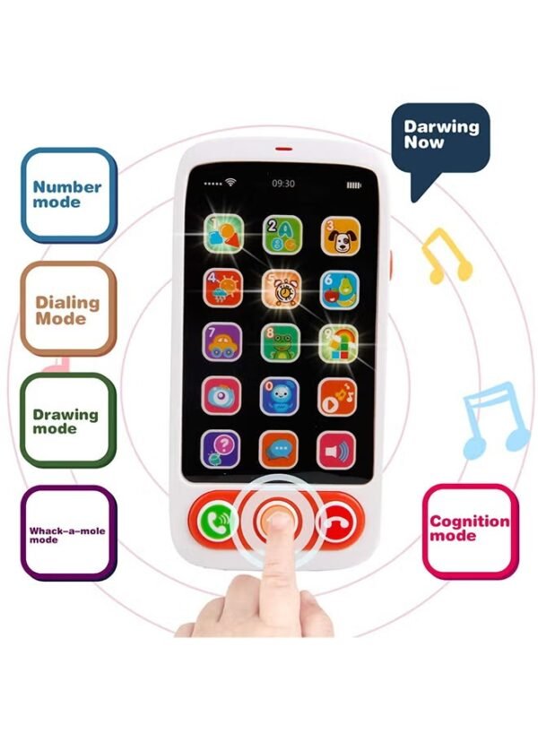 Switch to the next function, the number buttons on the touch screen will correspond to different learning content. Numeric mode: press 0-9 with voice and light and display the corresponding number. Cognition mode: press the button number 0-9 to play the voice according to the corresponding cognitive content. Such as graphic cognition, letter cognition, animals, weather, fruit, color, etc. Dial mode: pretend to dial on your own smartphone and press 1-8 to create and play music. Drawing mode: fun drawing function, touch button to light up the screen, cultivate children’s imagination. (15 keys) Mole-whip mode: enter the game and press the number key to match the illuminated key that appears on the screen. Exercise your child’s responsiveness.