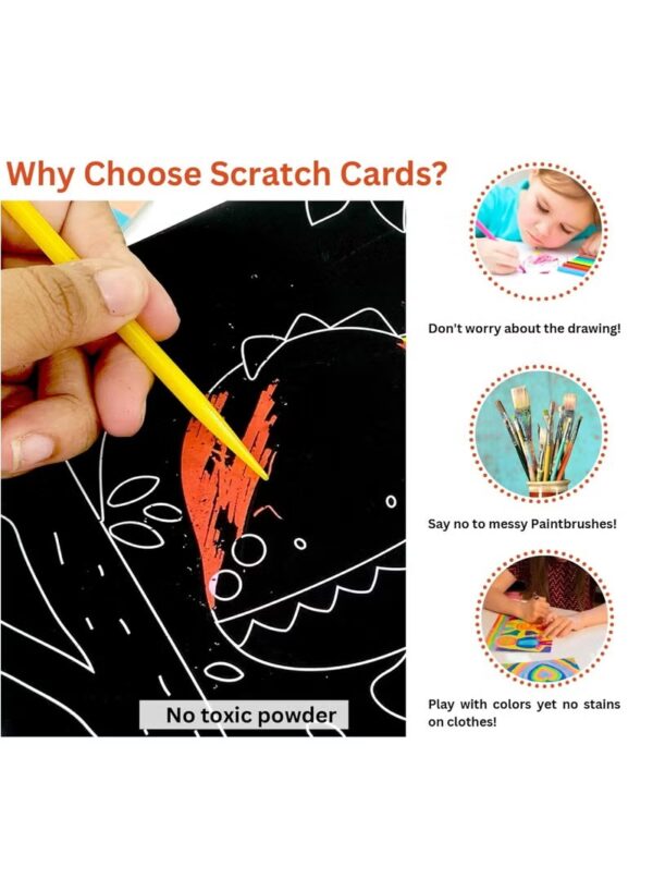 - Mess-Free & Travel-Friendly β No need for ink, paint, or markersβjust scratch and reveal vibrant rainbow colors underneath, making it a perfect activity for travel and classrooms.