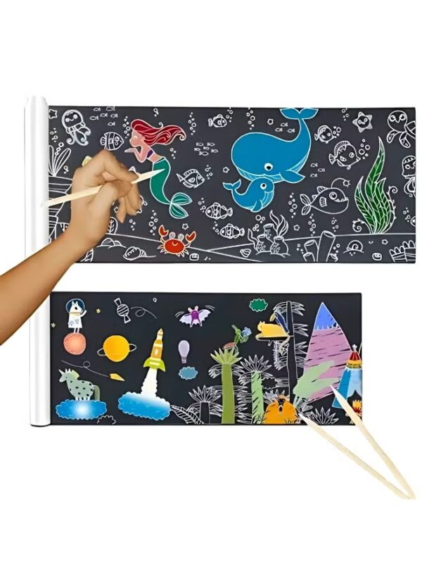 Unleash your childβs creativity with the Large 2 Meter x 30 cm Rainbow Magic Scratch Art Roll! This vibrant, mess-free, and travel-friendly scratch paper is the perfect way for kids to explore their artistic side while developing fine motor skills and creativity. Featuring a long, continuous scratchable surface, this art roll offers endless fun for children to draw, doodle, and create colorful masterpieces without the need for paints, markers, or messy supplies.The scratch art roll comes with 2 acrylic styluses, allowing two children to enjoy a fun and interactive creative experience together. As kids scratch away the black surface, bright rainbow colors are revealed, making each design unique and exciting. The pre-printed ocean illustrations add an extra layer of engagement, inspiring kids to discover and explore underwater themes while personalizing their artwork.Perfect for group activities, party games, birthday party favors, and holiday crafts, this scratch art roll provides hours of screen-free entertainment. Whether at home, in the classroom, or on the go, this non-toxic and educational art kit is ideal for fostering imagination and self-expression. The lightweight and portable design makes it easy to carry on vacations, road trips, and playdates, ensuring creative fun wherever your child goes. Encourage artistic exploration while strengthening fine motor skills and hand-eye coordination with this engaging and mess-free scratch art roll. Itβs an ideal gift for birthdays, school activities, return gifts, and holiday celebrations, offering an exciting and interactive way for kids to express themselves.